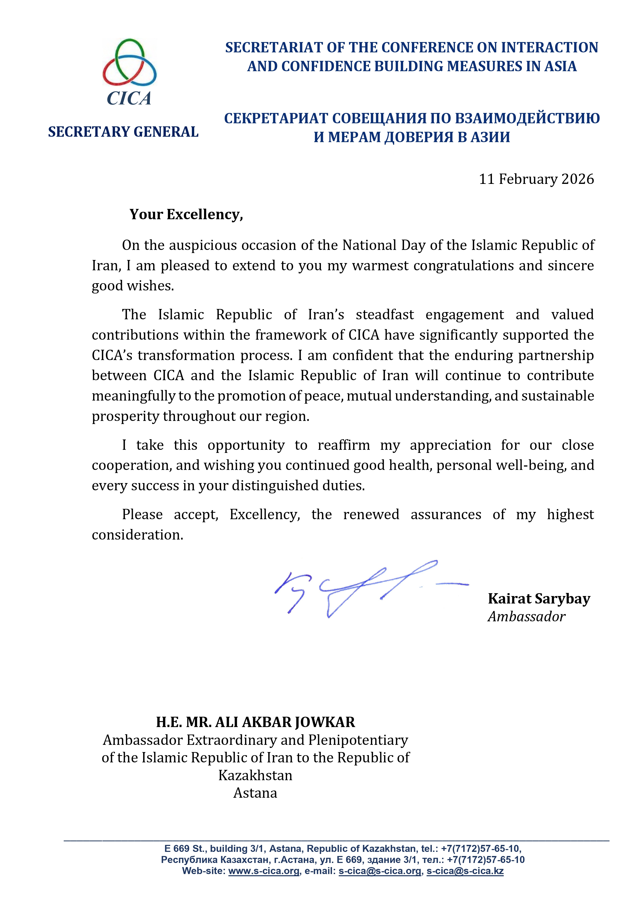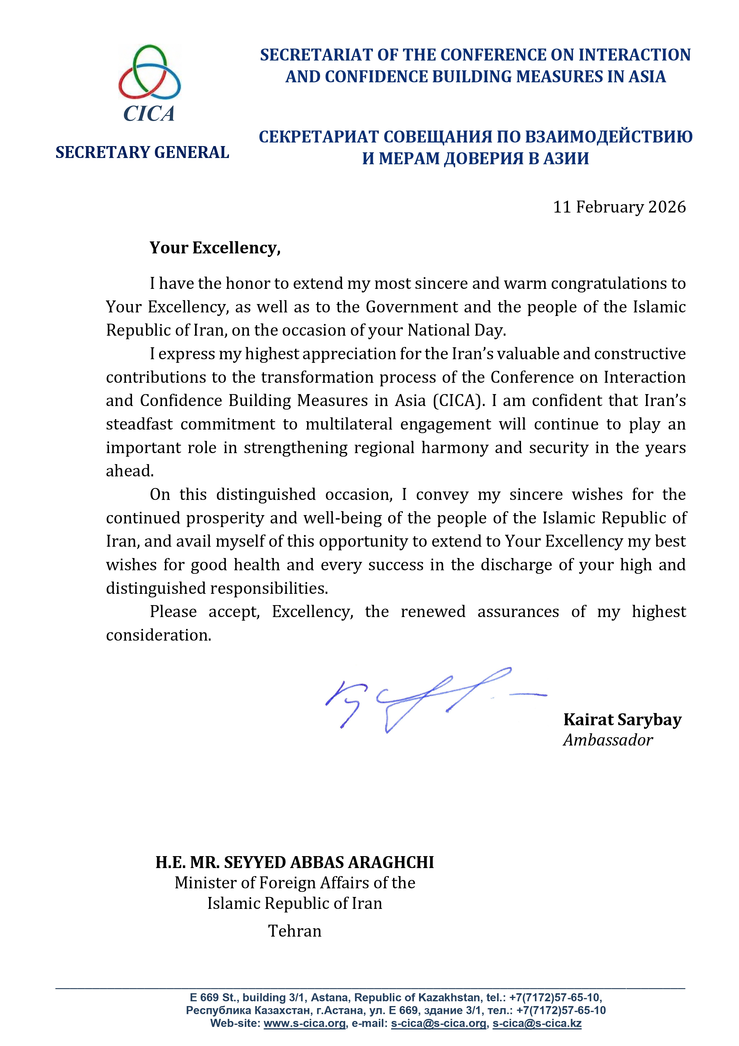 Congratulations letter on the occasion of the National Day of the Islamic Republic of Iran