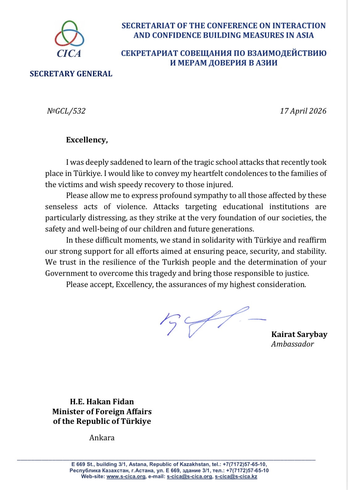 Letter of condolences of the CICA Secretary General on the tragic school attacks in Türkiye