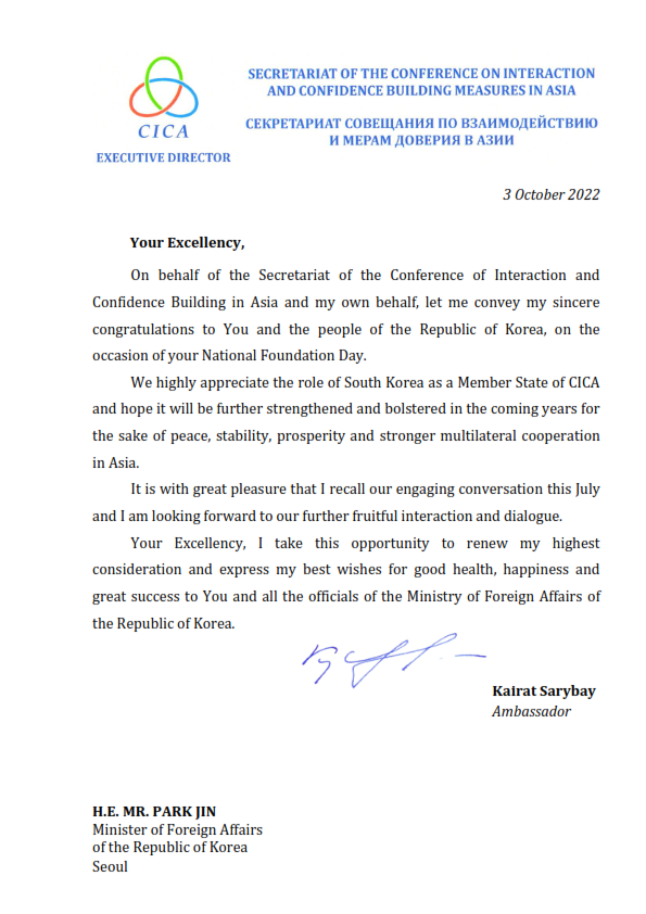 HomeStatements and Remarks of CICA Secretary General Ambassador Kairat Sarybay