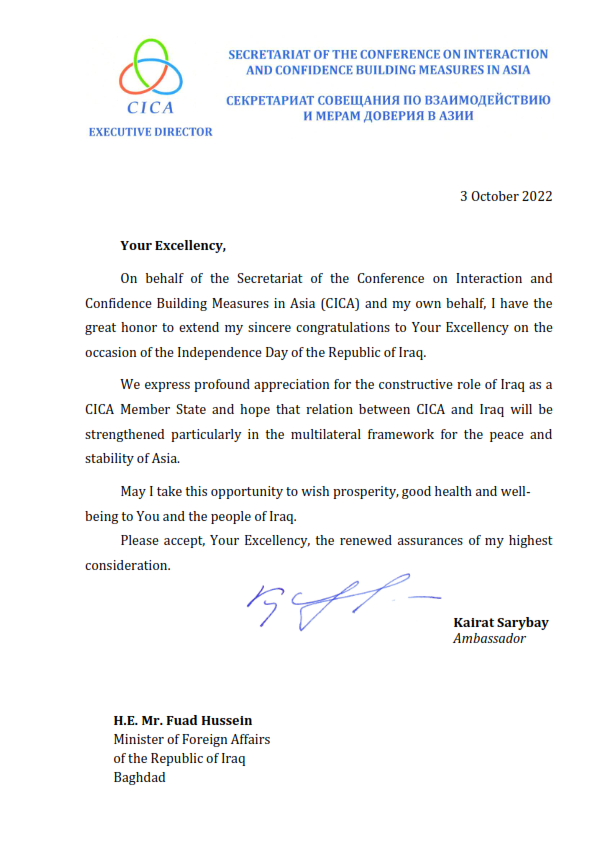 Letter of congratulations to the Minister of Foreign Affairs of the Republic of Iraq on the occasion of Independence Day of the Republic of Iraq