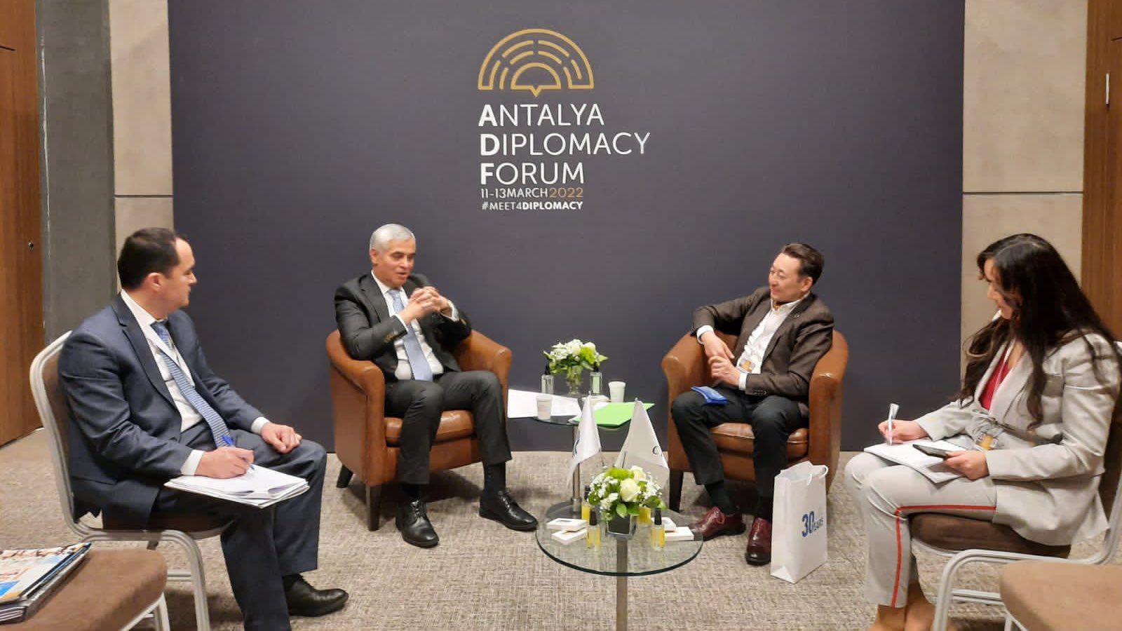 On the margins of the ADF CICA Executive Director had bilateral meetings with Minister of Foreign Affairs of Azerbaijan Jeyhun Bayramov, Minister of Foreign Affairs of Bahrain Abdullatif bin Rashid Al Zayani, Foreign Minister of Bangladesh Abdul Momen and Deputy Prime-Minister-Minister of Foreign Affairs of Iraq Fuad Hussein and the host - Foreign Minister of Turkey Mevlüt Çavuşoğlu. CICA Member States’ ministers were briefed on main aspects of the concept of transformation of CICA into a full-fledged international organization and preparations to the milestone Sixth CICA Summit to be held on 12-13 October 2022. Ambassador Sarybay expressed appreciation for strong commitment to CICA goals and objectives as well as for invaluable support to Kazakhstan’s Chairmanship priorities.