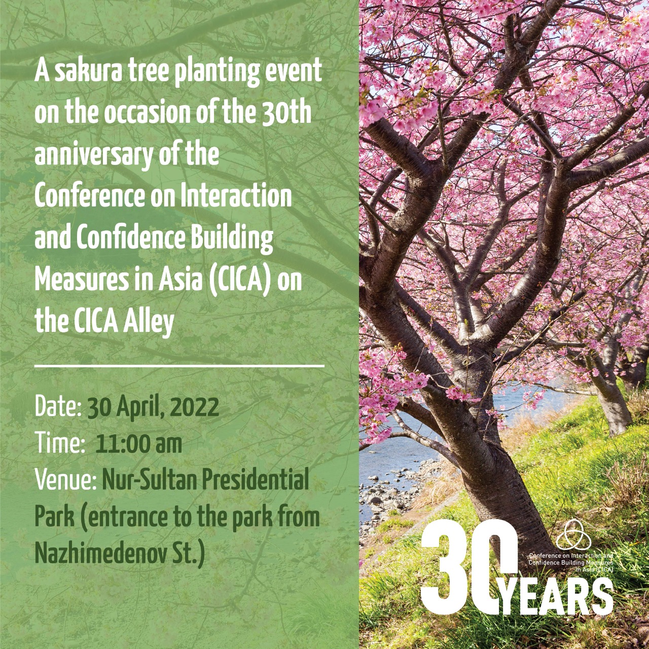 The CICA Secretariat together with the Sustainable Development Earth Foundation expects to plant 30 sakura seedlings in the Presidential Park of Nur-Sultan, which is dedicated to the 30th anniversary of the Conference. The event will be attended by Akimat of the Almaty district of Nur-Sultan, the leadership of the Ministry of Foreign Affairs of the Republic of Kazakhstan, CICA Secretariat, heads of diplomatic missions of the CICA Member and Observer States, as well as the media representatives.