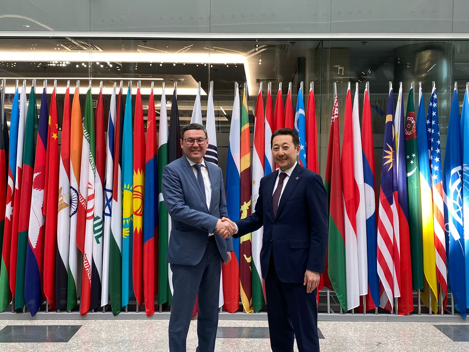 On 20 April 2022, CICA Executive Director Ambassador Kairat Sarybay met with a newly appointed Director of the Kazakhstan Institute for Strategic Studies under the President of the Republic of Kazakhstan Yerkin Tukumov at the CICA Secretariat.