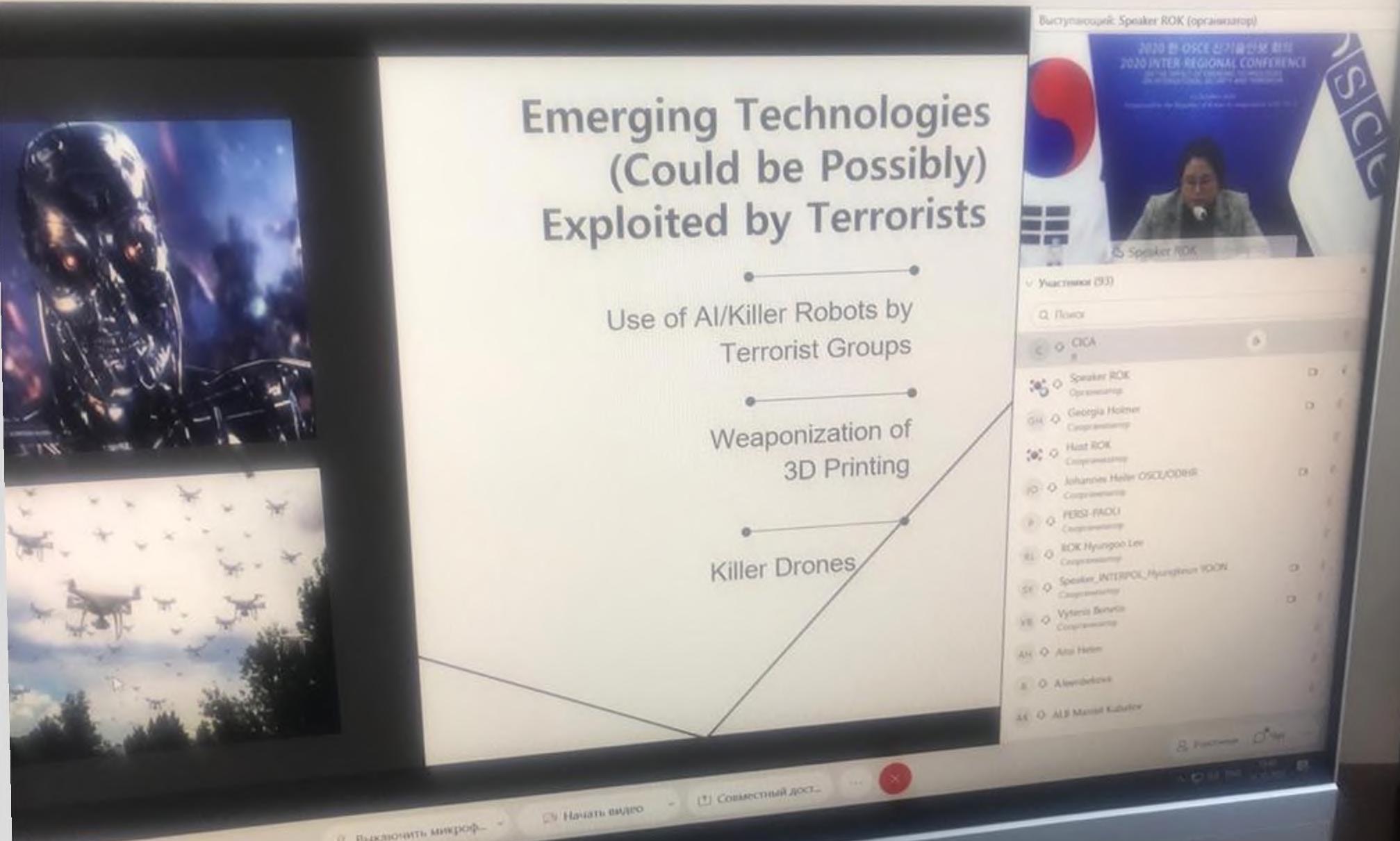On October 14, 2020, Deputy Executive Director of the CICA Secretariat Ms.Chi Fang and the Member of the Professional Personnel Mrs.Sholpan Yelkeyeva took part in the virtual Interregional Conference "Impact of New Technologies on International Security and Terrorism", organized by the Ministry of Foreign Affairs of the Republic of Korea and the OSCE Secretariat.