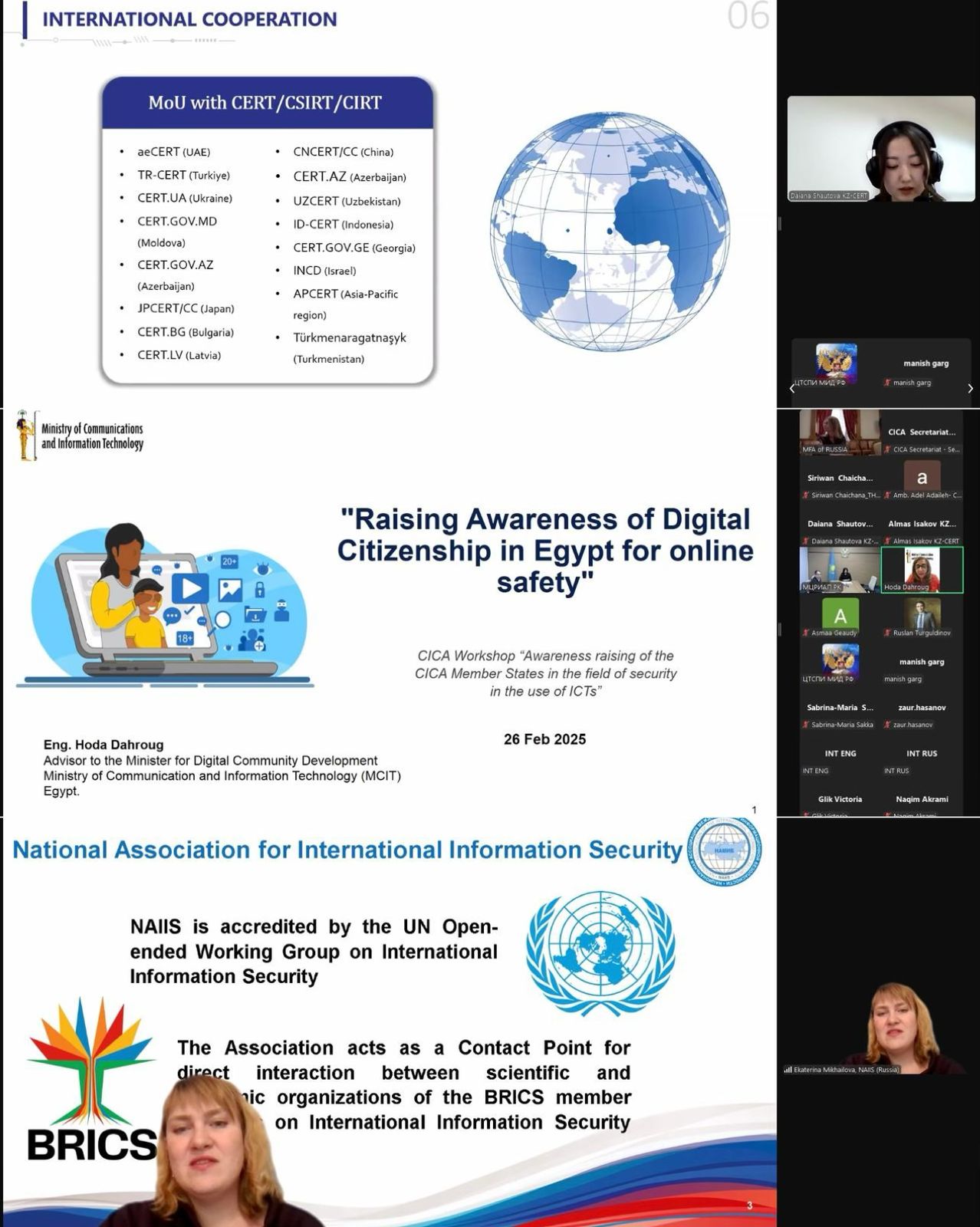 26 February 2025 – Moscow – The Russian Federation, in collaboration with the Republic of Kazakhstan, the Islamic Republic of Iran, and the Secretariat of the Conference on Interaction and Confidence Building Measures in Asia (CICA), organized an online workshop on raising awareness of ICT security among CICA Member States. The event aimed to highlight effective strategies for enhancing awareness of emerging cyber threats and fostering regional cooperation in this critical domain.It brought together top specialists and representatives from relevant agencies, academia and IT-companies across sixteen CICA Member States.