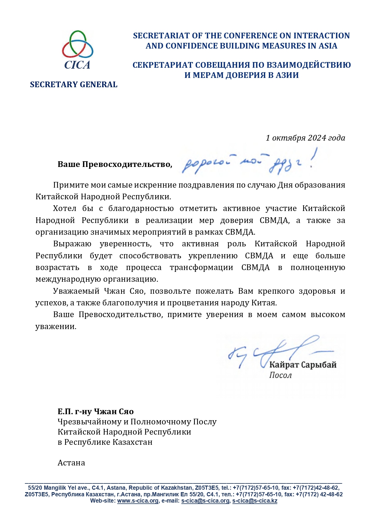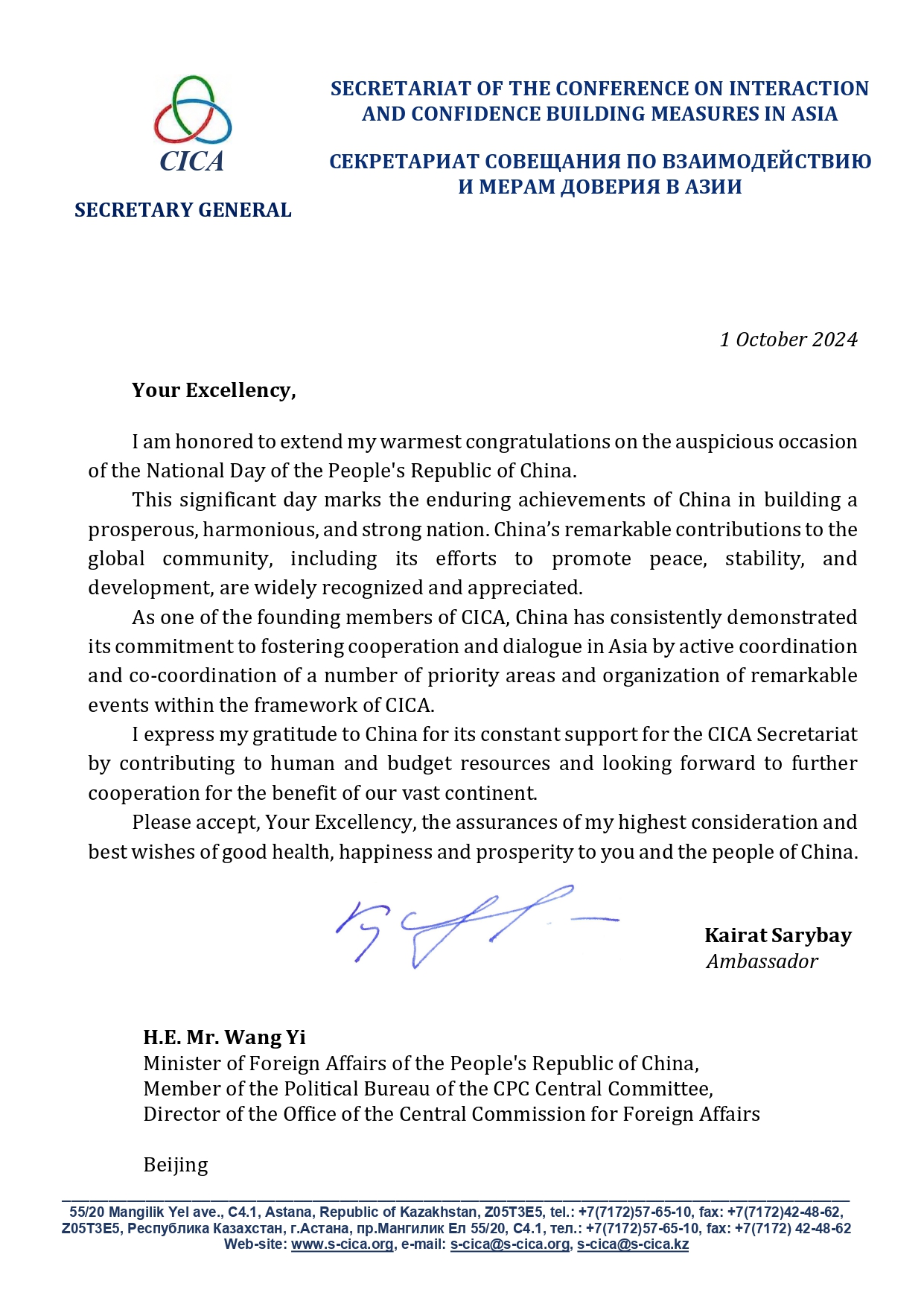 Statements and Remarks of CICA Secretary General Ambassador Kairat Sarybay