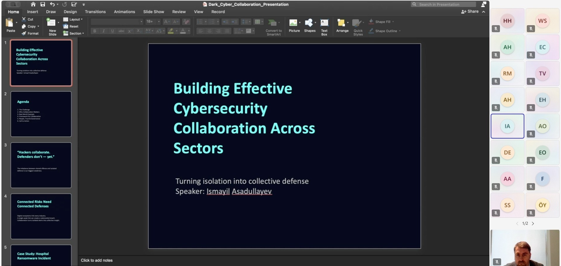 The technical segment of the Conference featured presentations by Azerbaijani experts. Mr. Aykhan Huseynli, Senior Cybersecurity Specialist of CERT.AZ, outlined the process of establishing a capable Threat Intelligence Program, emphasizing the need for timely detection and sharing of cyber incidents. Ms. Aysel Hadiyeva from the Innovation and Digital Development Agency delivered a presentation on Cyber Resilience Through Government-Private Sector Collaboration, highlighting national strategies, infrastructure protection, and capacity-building programmes in cyber hygiene and technical competence. Mr. Ismail Asadullayev of the Ministry of Digital Development and Transport presented Building Effective Cybersecurity Collaboration Across Sectors, focusing on cross-sector partnerships, engagement with universities and cooperation mechanisms between the government and private sector.