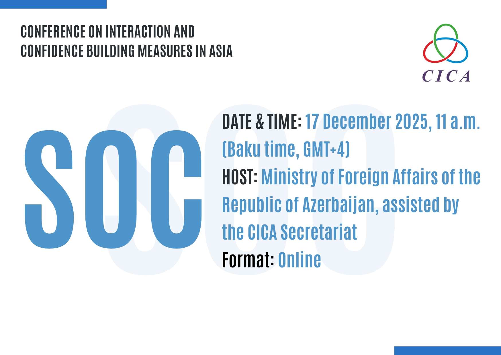 The CICA Senior Officials Committee (SOC) will convene under the Chairmanship of the Republic of Azerbaijan to discuss key issues on the current CICA agenda and to adopt decisions and documents.