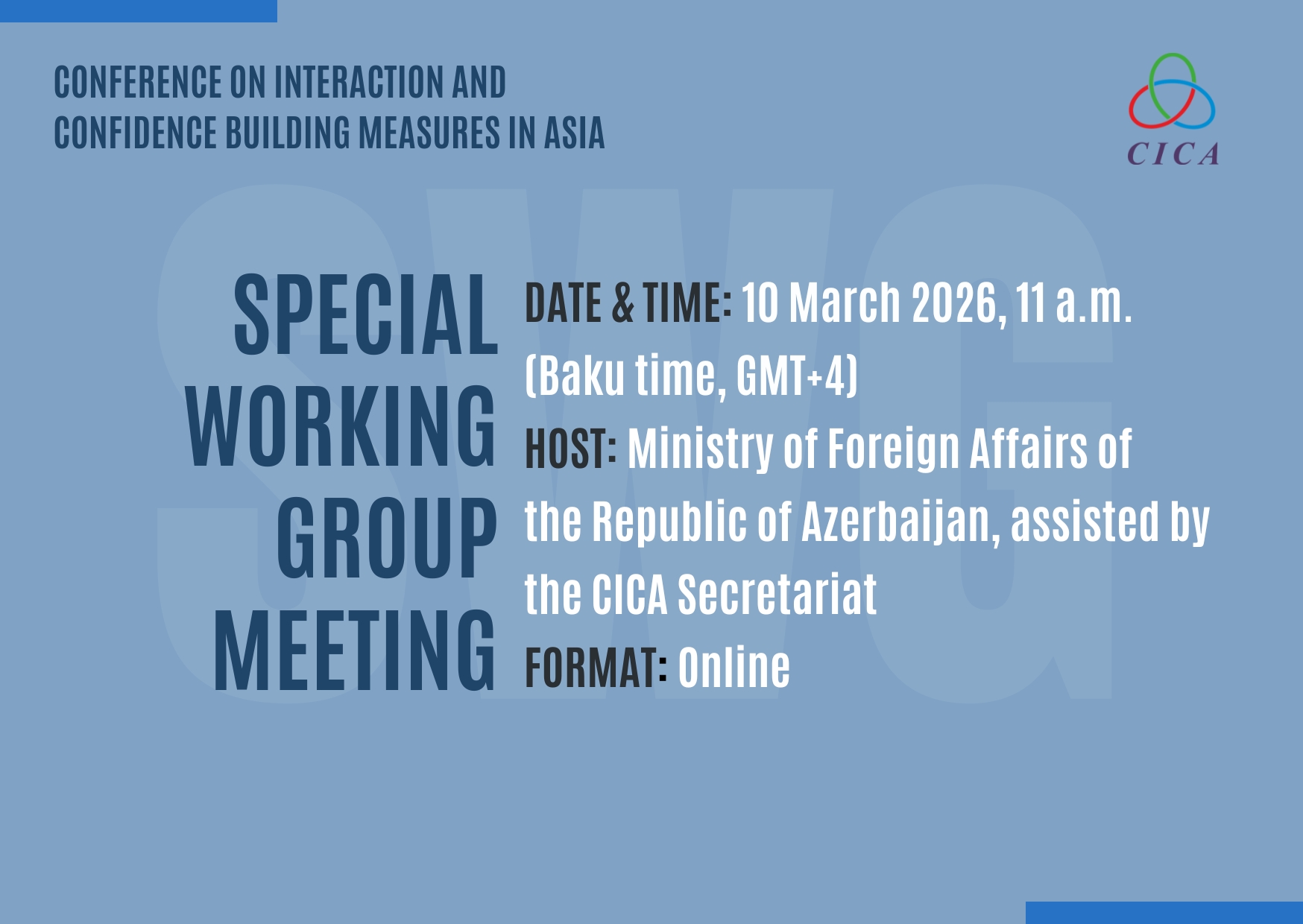 Objective: The CICA Special Working Group (SWG), under the chairmanship of the Republic of Azerbaijan, will reconvene to continue discussions on matters related to CICA’s institutional development.