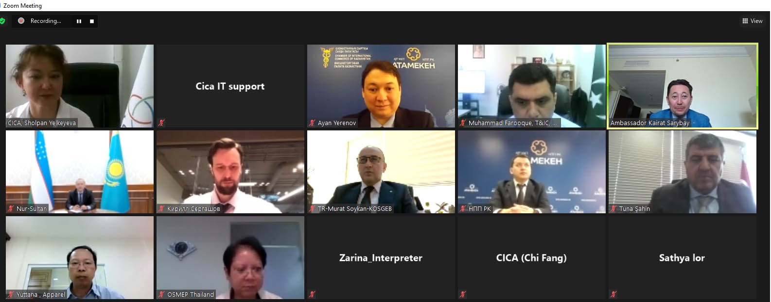 Executive Director of the CICA Secretariat Ambassador Kairat Sarybay addressed the participants of the Board meeting with welcoming remarks and briefed on the implementation of Confidence Building Measures in the Economic Dimension, which covers the Business Council activities.He noted that the Economic Dimension, as the most important part of the CICA Catalog of Confidence Building Measures, remains in the focus of increased attention in the context of supporting small and medium businesses in the pandemic environment. The Ambassador also noted the need to bring together the efforts of all CICA member states to effectively respond to the pandemic challenges (full text of the speech).