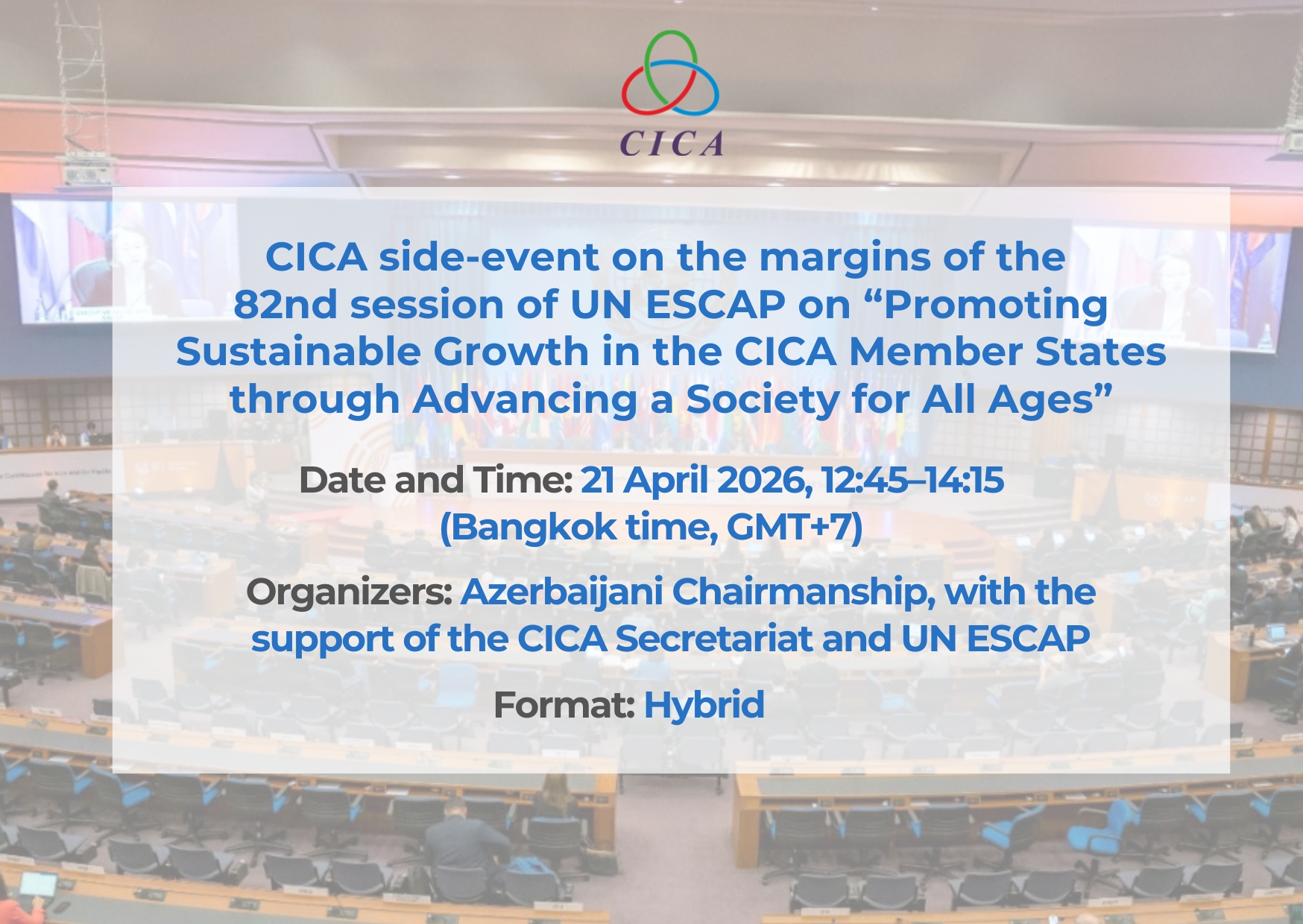 The side-event, held on the margins of the 82nd session of UN ESCAP, aims to promote sustainable growth in CICA Member States through advancing a society for all ages. It will highlight CICA’s ongoing work and achievements in the Economic and Human dimensions, with a particular focus on the activities of its advisory bodies, including the Women’s Council, Youth Council and Business Council.