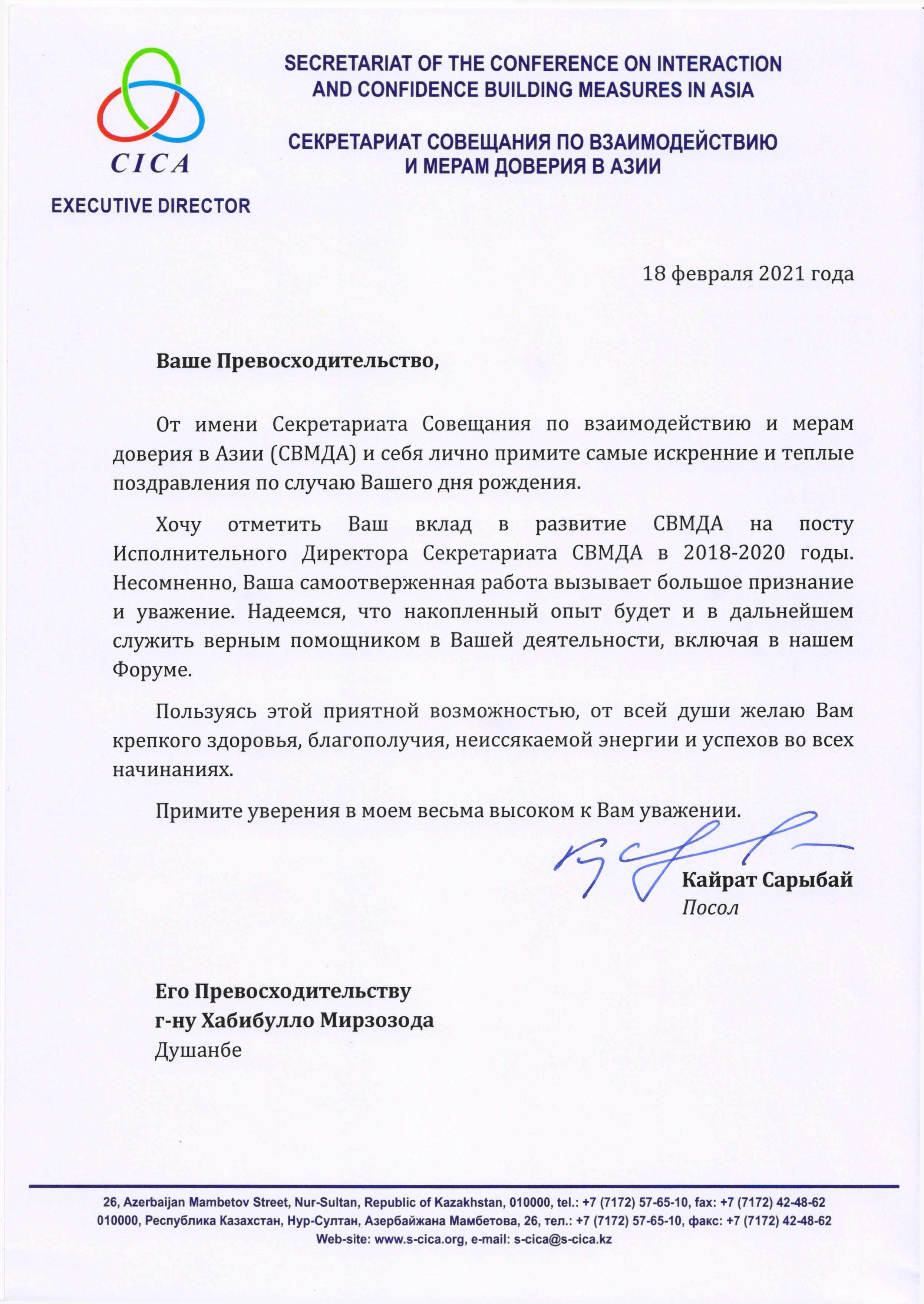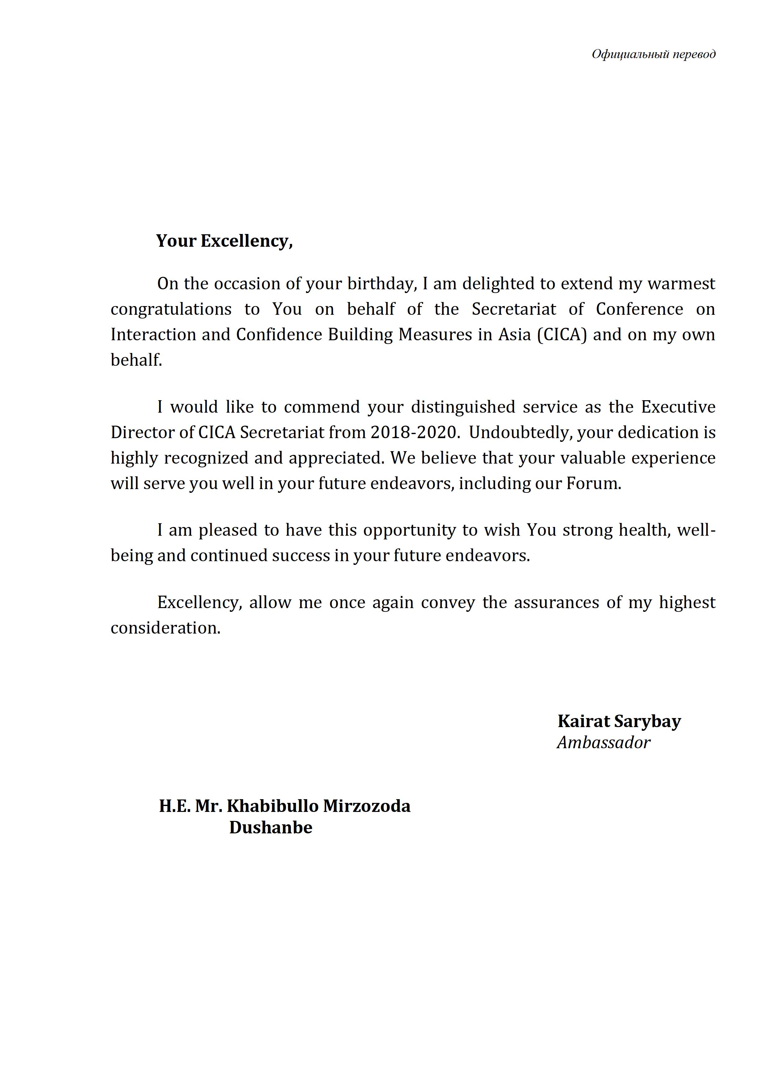 Letter of congratulations to H.E. Mr. Khabibullo Mirzozoda on his birthday