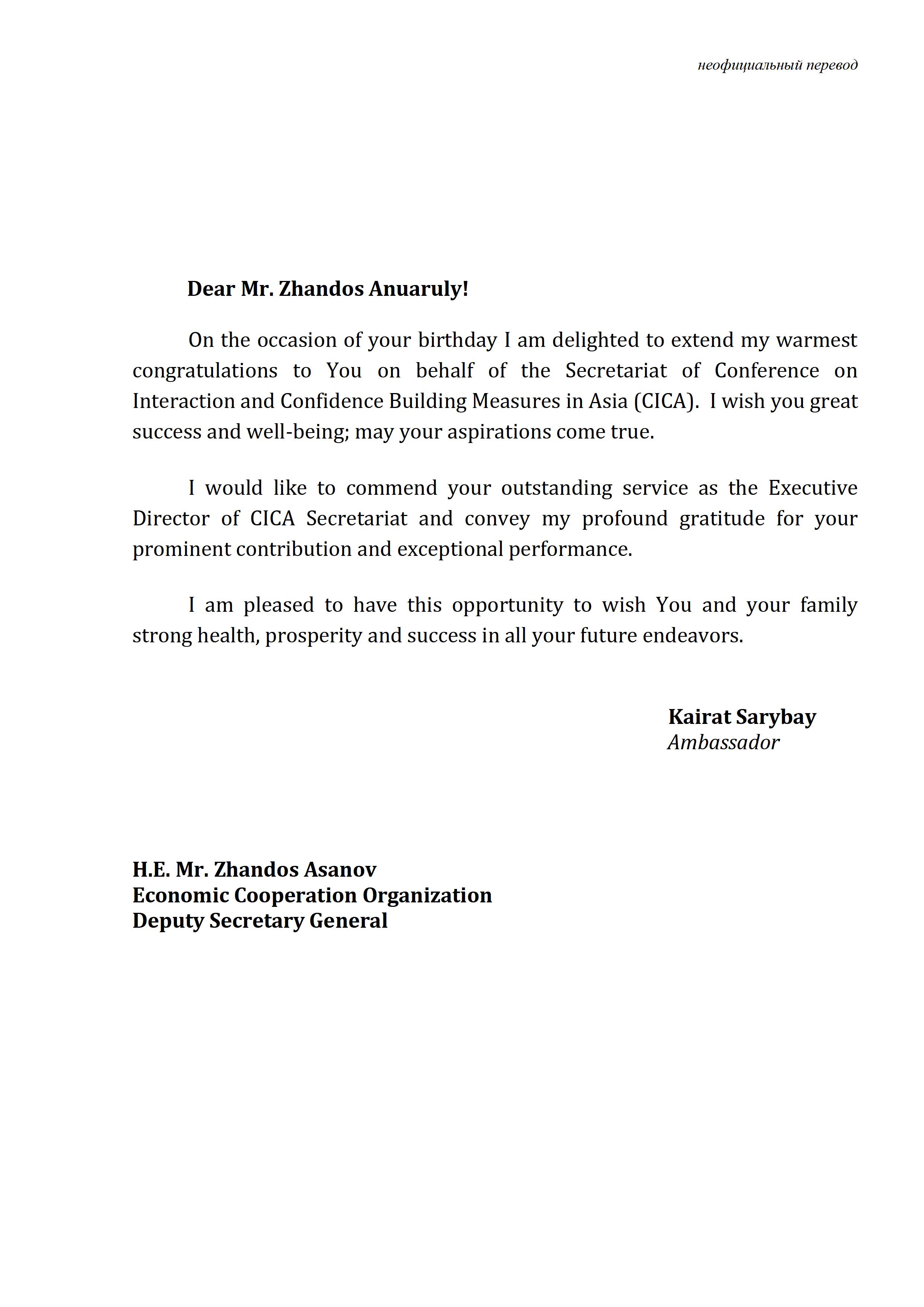Letter of congratulations to H.E. Mr. Zhandos Asanov on his birthday