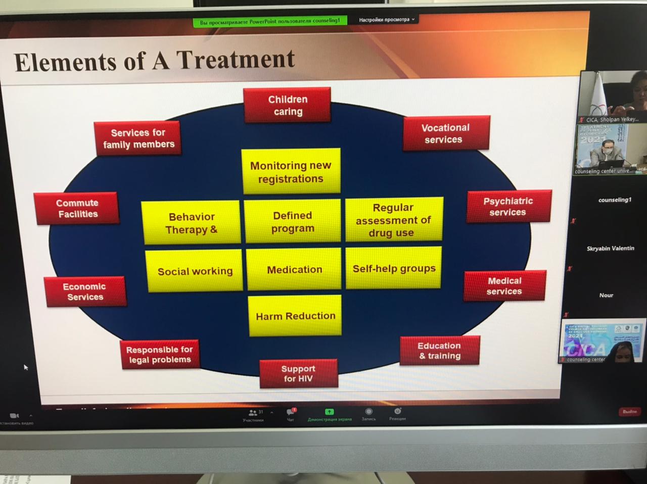The training course was divided into 6 thematic sessions: “Epidemiology and main principles of drug dependence treatment”, “Etiology and principles of neurobiology for treatment of drug use disorders”, “Pharmaceutical interventions for treatment of drug addiction”, “Non-drug treatment of drug addiction”, “Special aspects of treating drug addicted children and teenagers”, “Principles of dealing with a drug overdose and the process of recovery”.