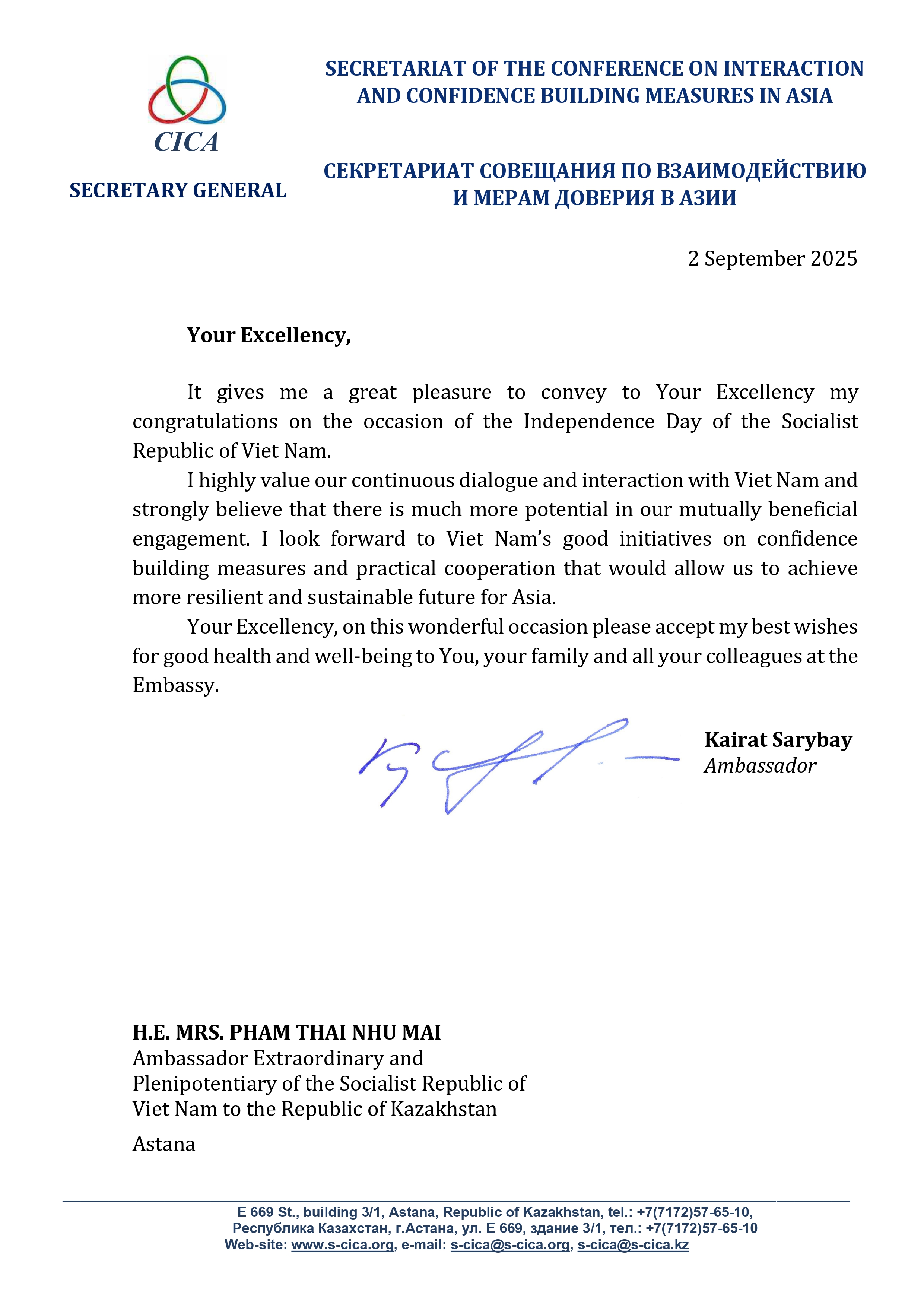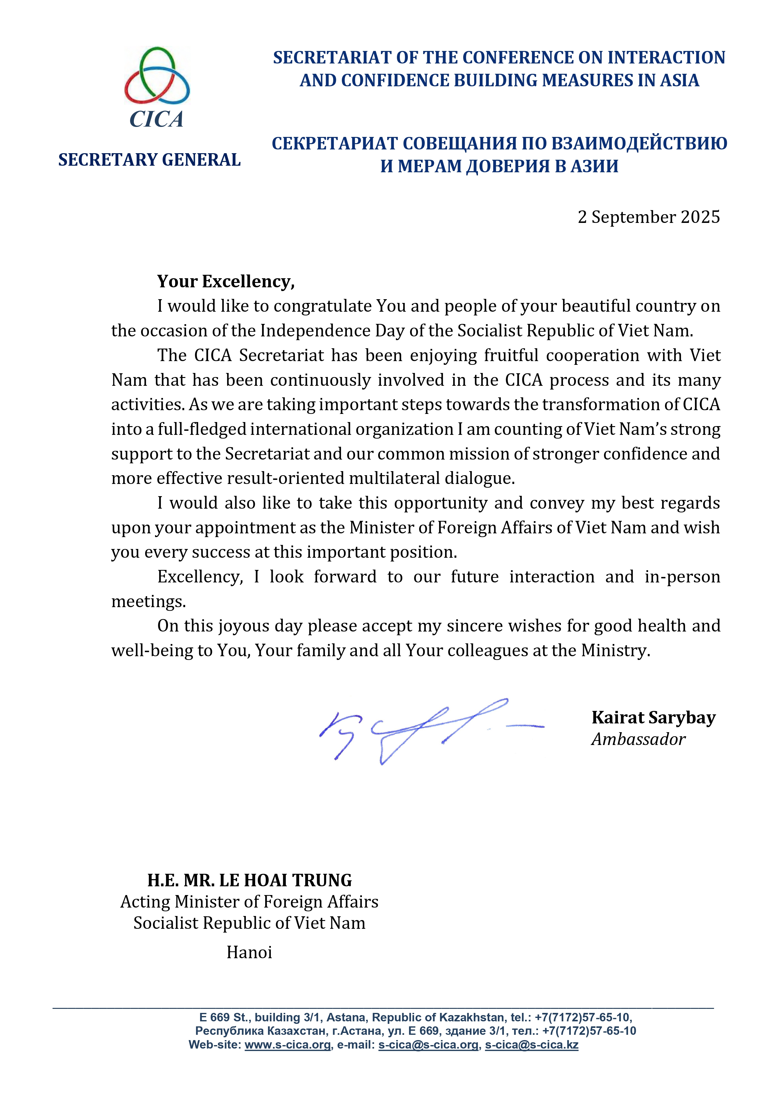 Congratulations on the occasion of the Independence Day of the Socialist Republic of Viet Nam