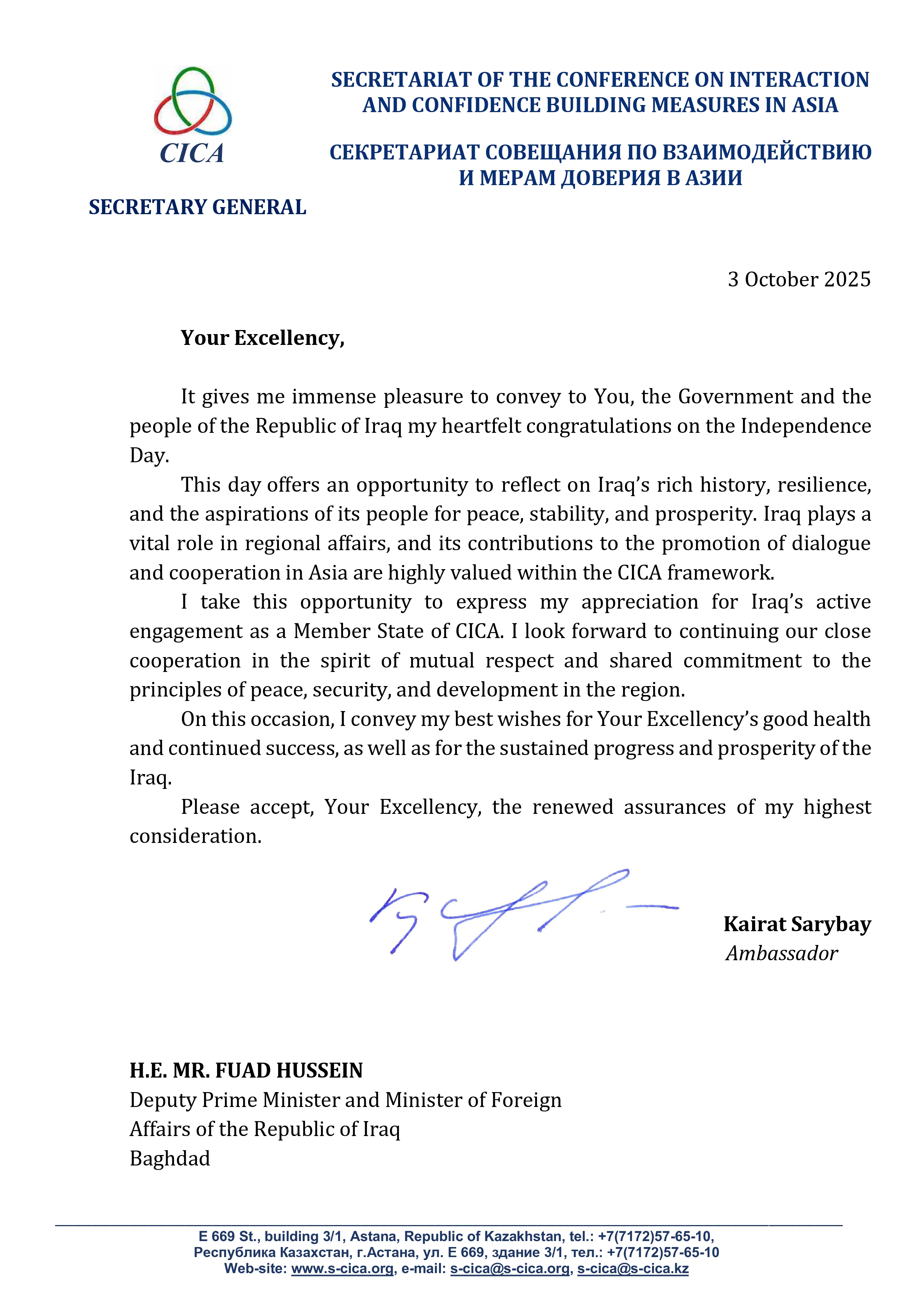 Congratulations letter on the occasion of the National Day of the Republic of Iraq