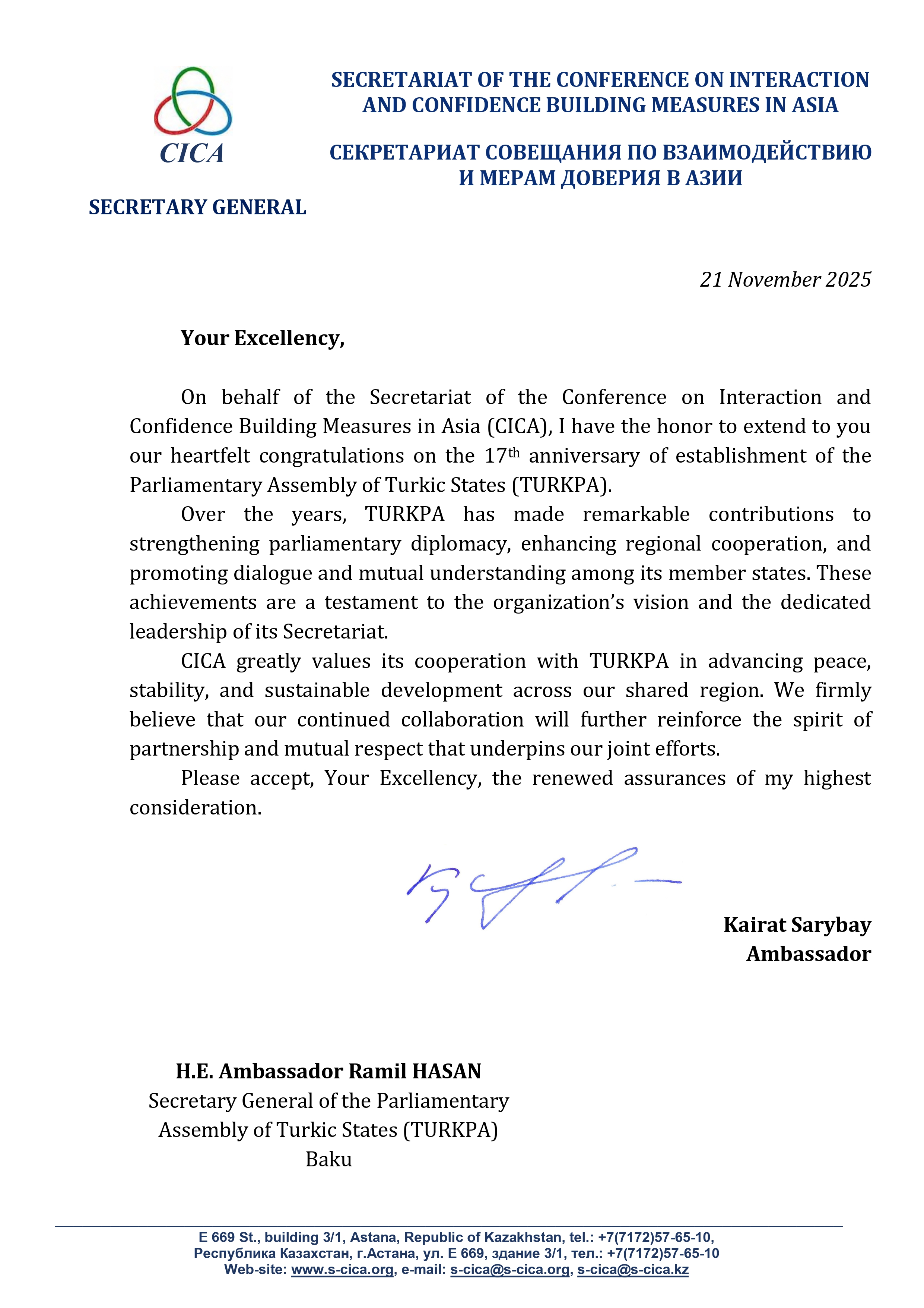 Congratulations on the occasion of the establishment of the Parliamentary Assembly of Turkic States (TURKPA)