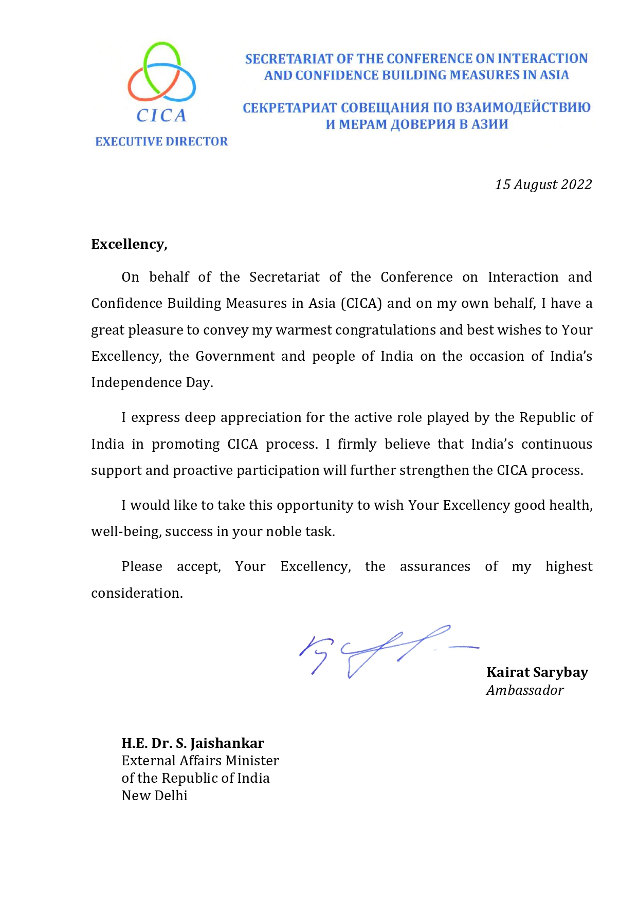Letter of congratulations to the External Affairs Minister of the Republic of India on the occasion of India's Independence Day