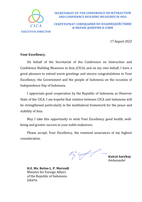 Letter of congratulations to the Minister for Foreign Affairs of the Republic of Indonesia on the occasion of Independence Day of Indonesia