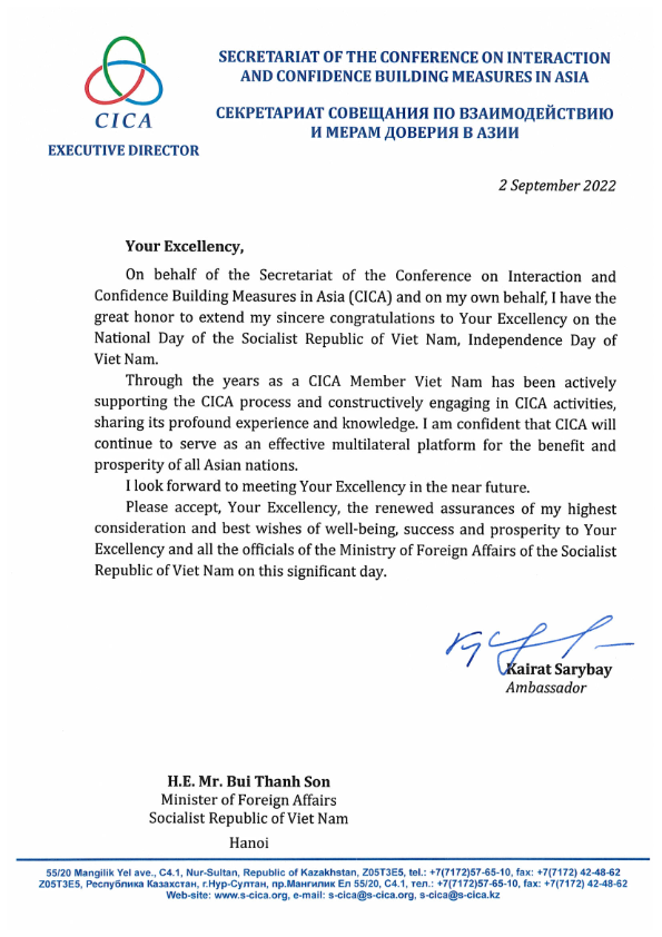 Letter of congratulations to the Minister of Foreign Affairs of the Socialist Republic of Viet Nam on the occasion of Independence Day
