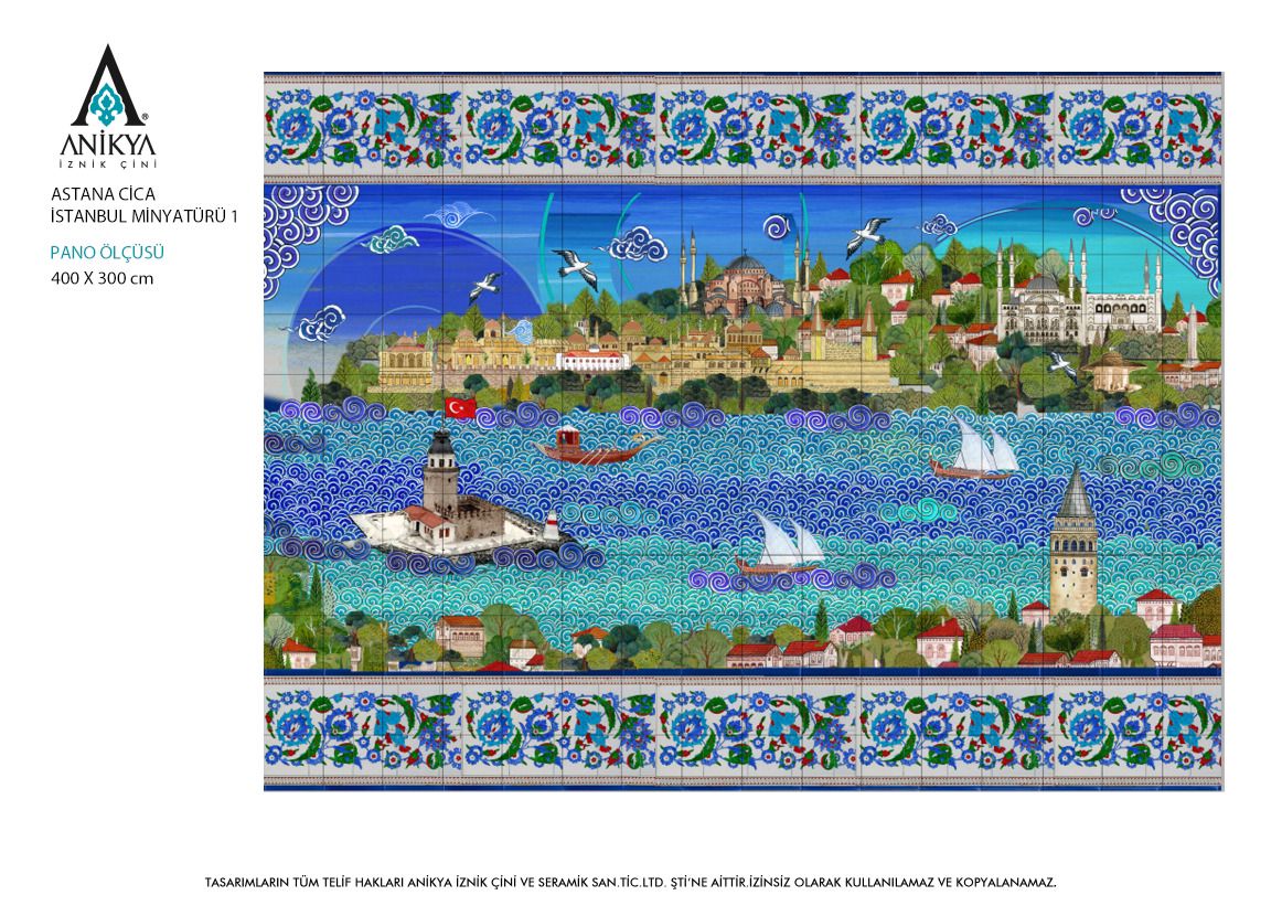 In a handmade İznik ceramic (çini) panel designed by the Anikya İznik Tile design team, the panoramic view of the Bosphorus is reinterpreted through the principles of miniature and tile art. The piece is executed entirely by traditional methods on a quartz-rich ceramic body, using the underglaze technique.