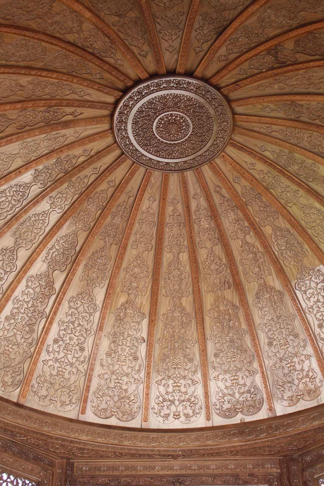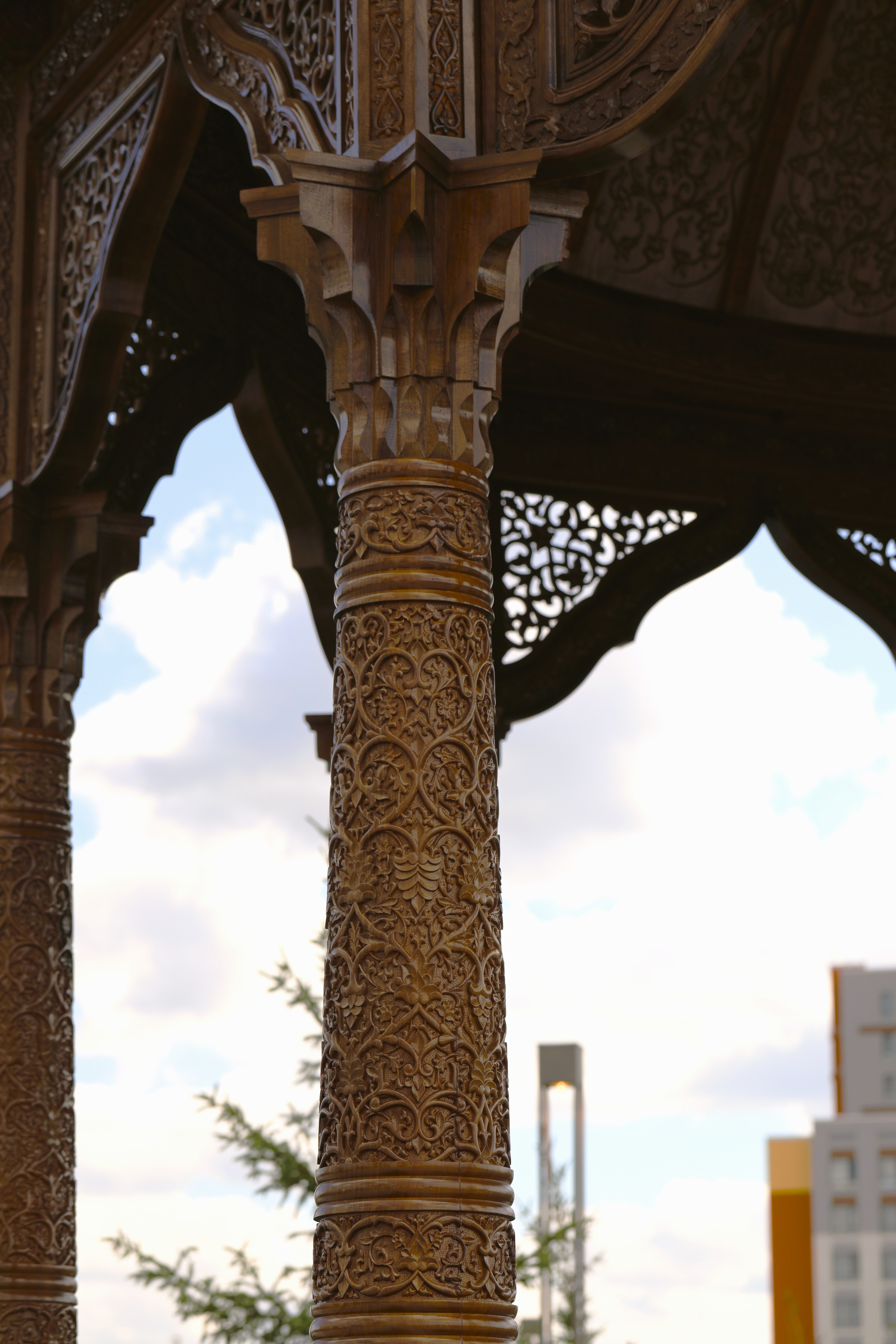 Carved with delicate patterns, eight slender walnut wood columns symbolize spirituality and harmony. The domed roof is covered with copper, giving the structure a refined sheen, while the base (floor) is lined with natural granite.