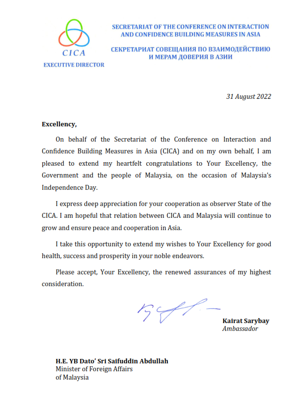 Поздравительное письмо Министру иностранных дел Малайзии по случаю Дня независимости Малайзии